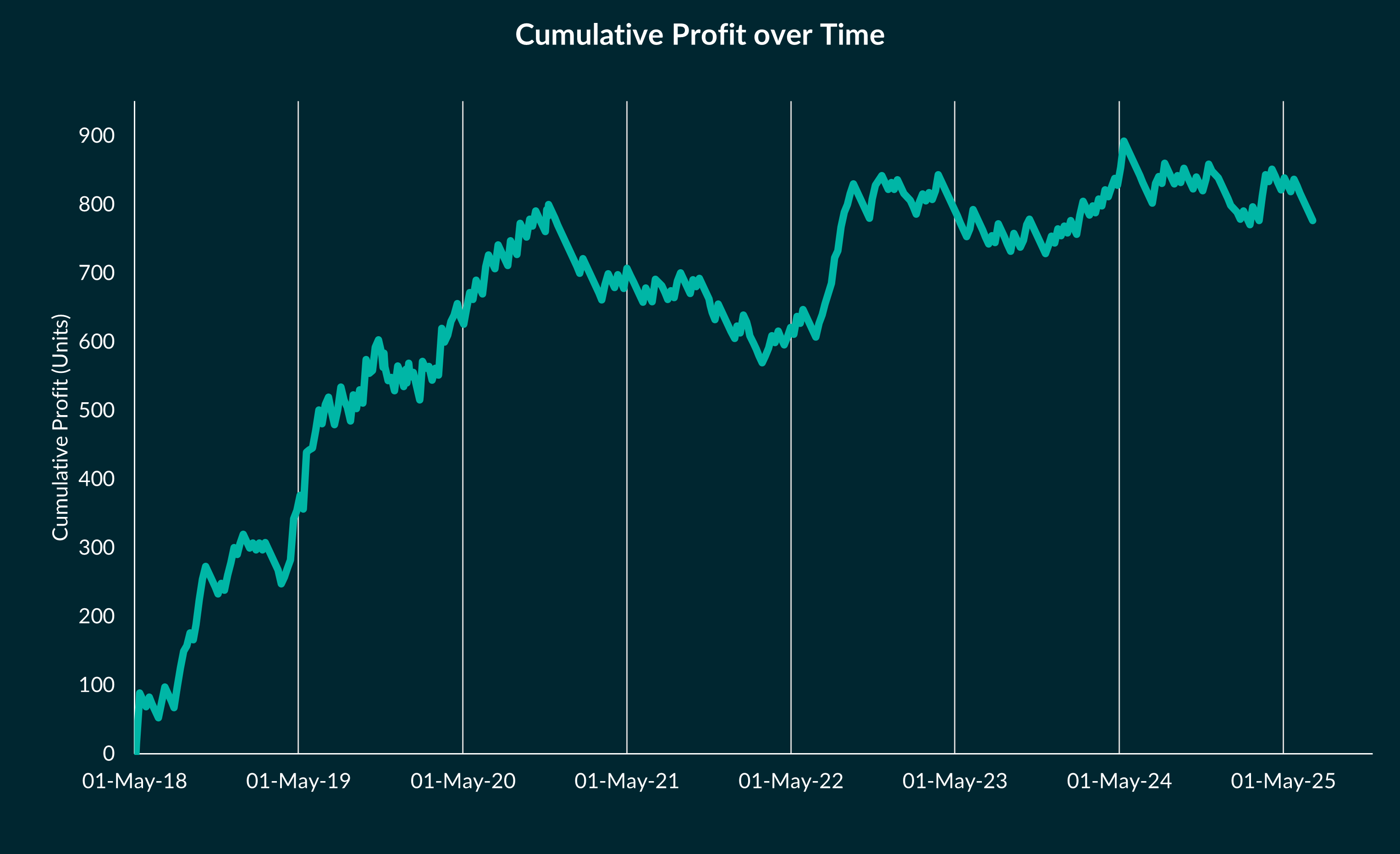 Return calculated by the aggregate of the stake of bets won multiplied by the best price offered by Australian Wagering Operators after the tips are sent out minus the stake of all bets.
